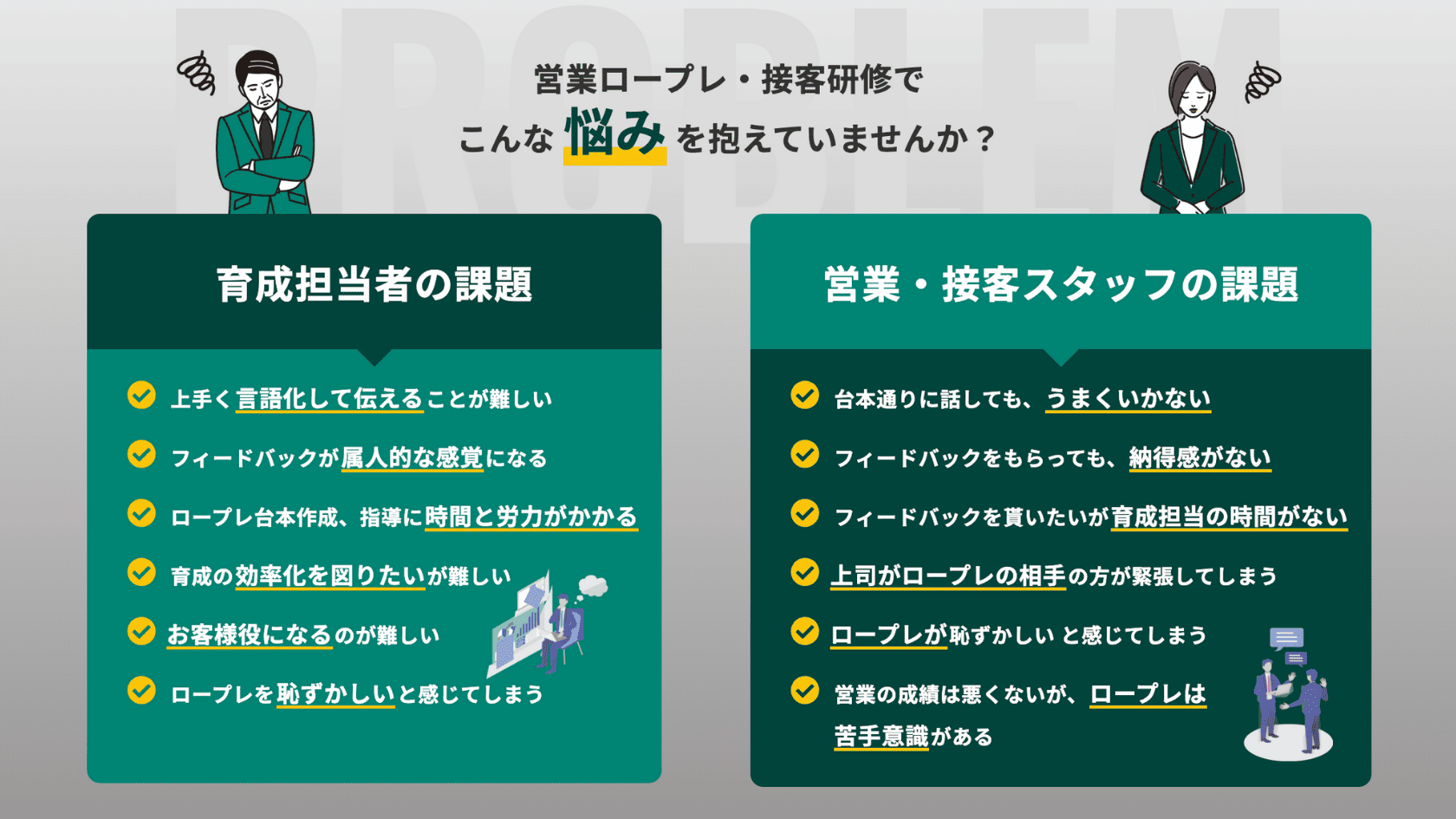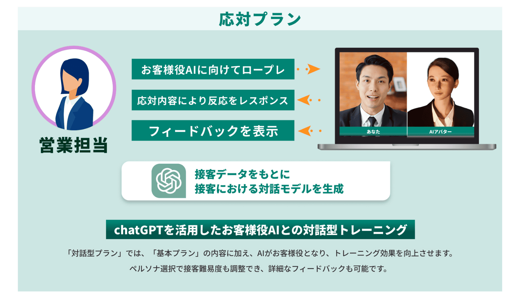 • AIによる営業・接客トレーニングの流れを、イラストや図解を用いてわかりやすく表現