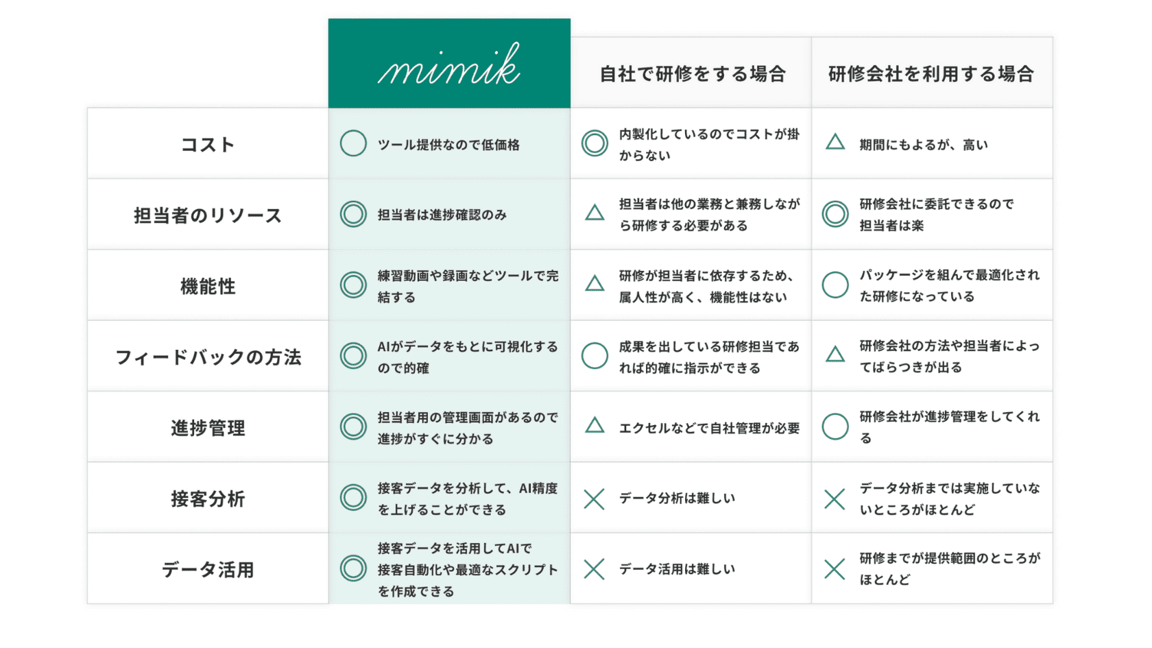 • 従来の営業・接客研修と比較し、mimikの優位性を明確に伝える構成を採用