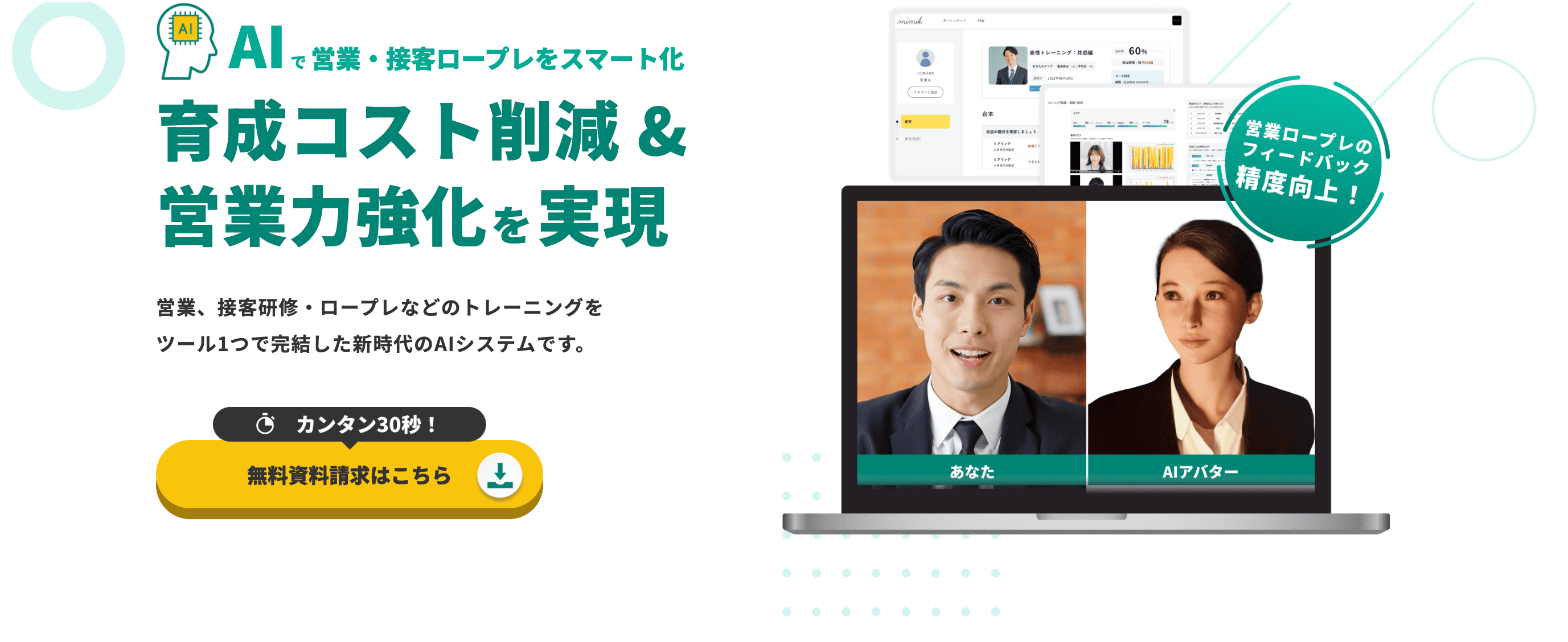 mimik(https://lp.mimik.jp/) は、AIを活用して営業・接客ロープレをスマート化し、育成コスト削減&営業力強化を実現する新時代のトレーニングツールです。当社では、この革新的なサービスの強みを最大限に伝えるため、視覚的にわかりやすいデザイン、直感的なUI設計、コンバージョン率を高めるCTA設計を取り入れ、効果的なLPを制作しました。
