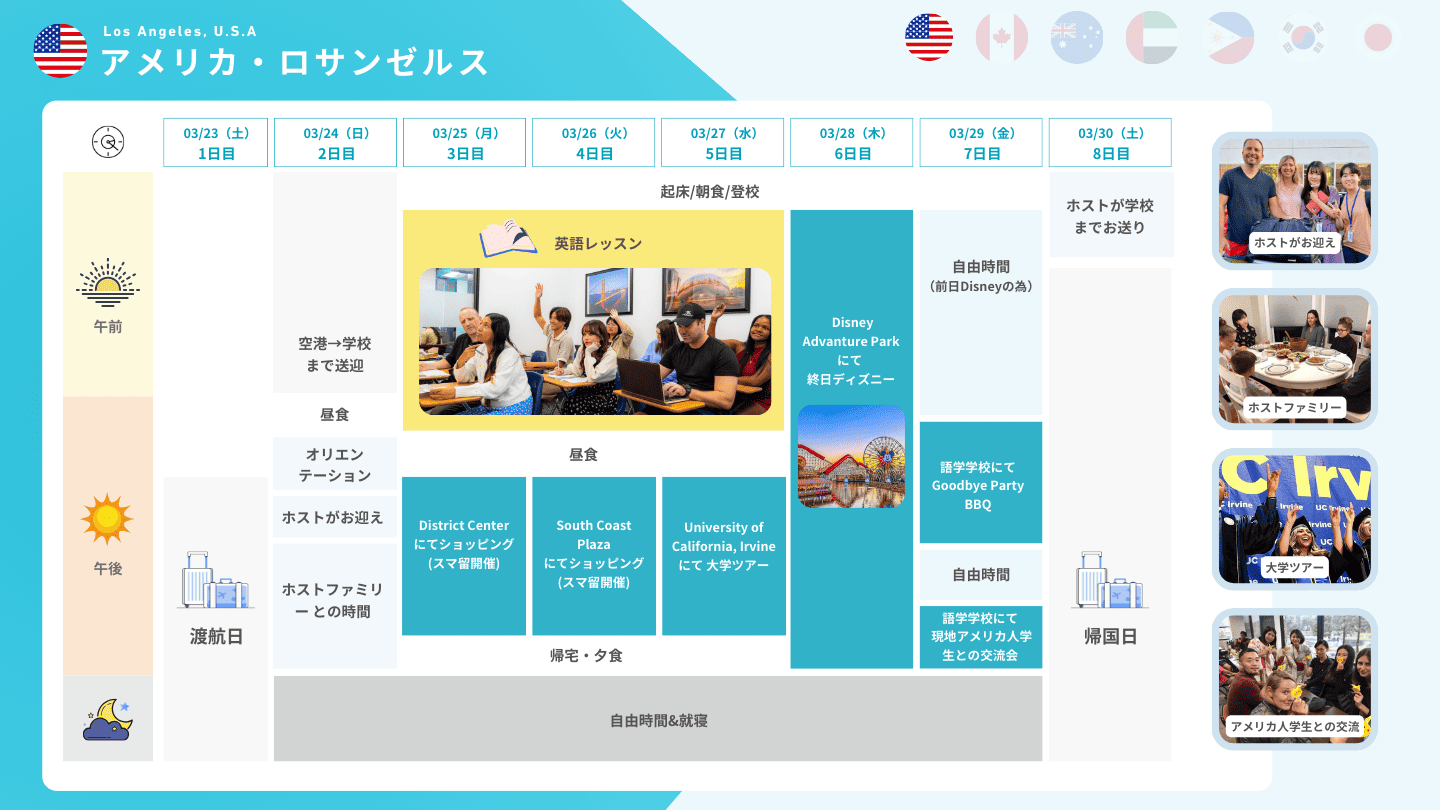 春休みに参加できる短期留学プログラムの魅力を分かりやすく伝える資料を制作しました。 各国の情報を直感的に確認できるよう、ボタン一つで国ごとの詳細や費用がすぐに分かる設計を採用し、スムーズに比較・検討できる構成にしました。視覚的にも見やすく、春休みの留学を考える方にとってワクワクするようなデザインに仕上げています。