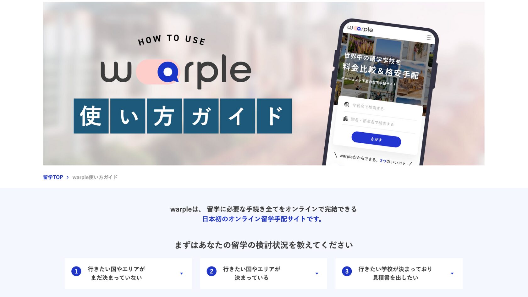 Warple(https://warple.jp/) は、世界各国の留学先の見積もりを取得し、そのまま予約・決済まで完結できる革新的なプラットフォームです。この機能を軸に、ユーザーの利便性向上と、スムーズな体験を提供するためのサイト設計を行いました。以下の課題に対し、具体的なソリューションを実装しました。
