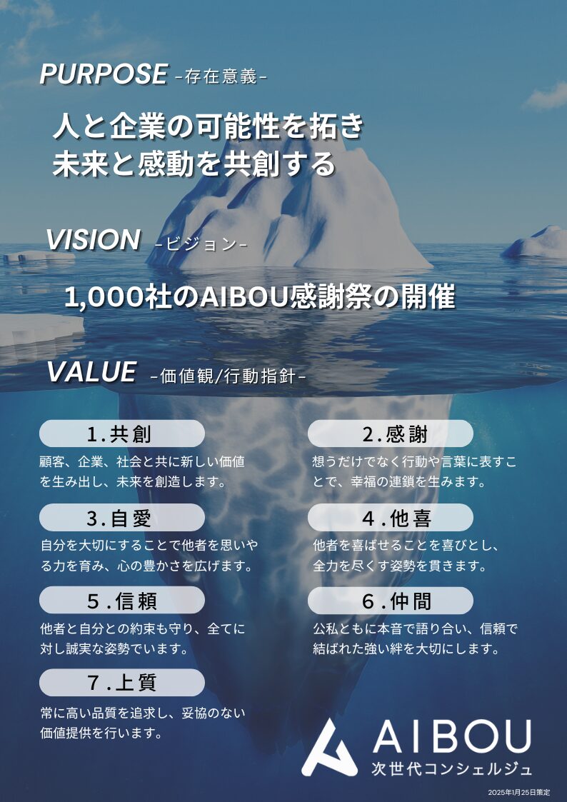 AIBOU=共創。私たちの会社は、「人と企業の可能性を拓き、未来と感動を共創する」というパーパスのもと、人と企業の無限の可能性を引き出すことを目指しています。この理念の実現には、社員一人ひとりの成長が欠かせません。